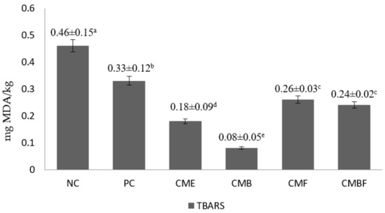 The antioxidative potential of the chicken breast meat samples that were hydrolyzed with various CM mushroom extracts was measured by DPPH scavenging activity and TBARS assay (Figure 1 and Figure 2). The DPPH radical scavenging activity percentage of the negative control was 14.29%. It was not significantly different from that of the positive control at 15.22% (p > 0.05). Furthermore, the radical scavenging activity was observed to be the highest in the meat samples that were hydrolyzed with CMB (40.32%), followed by CMBF (34.2%), CME (32.97%), and CMF (26.43%), respectively. Interestingly, the CME-treated samples showed significantly higher antioxidative activity in comparison to the CMF-treated samples (p < 0.05). In addition, when confirmed by the TBARS assay, the suppression of malondialdehyde (MDA) as the secondary metabolite from lipid oxidation ranged between 28 and 83% when compared to the negative control, with the strongest reduction that was observed in the sample group that was hydrolyzed by CMB (p < 0.05). Subsequently, MDA-suppressing activity from highest to lowest in this study was CME, CMBF, CMF, PC, and NC, respectively. The enzymolysis pre-treatment groups shared similar lipid oxidation-suppressing activities and were not significantly different (p > 0.05), except for the positive control when compared to CME (p < 0.05). The CME-treated group had a markedly lower MDA content (0.18 mg MDA/kg) when compared to the positive control (0.33 mg MDA/kg).