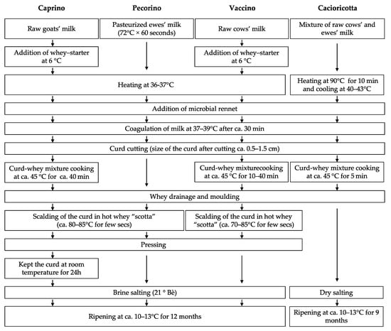 Caprino (goats’ milk cheese), Pecorino (ewes’ milk cheese), Vaccino (cows’ milk cheese), and Cacioricotta (50% cows’ and ewes’ milk cheese) TAP cheeses were manufactured at a semi-industrial dairy plant located at Putignano, Bari, Southern Italy, according to traditional protocols (Figure 1), which were characteristic for each cheese, but shared the following aspects: (i) coagulation parameters were identical (including the microbial rennet used) for all the cheeses, except for a slightly higher renneting temperature adopted for curding Cacioricotta; (ii) except for Cacioricotta cheese, curd was scalded in the “scotta”, the hot, whey-based by-product of ricotta manufacturing; (iii) cheeses were salted in brine, except for Cacioricotta (dry salting); (iv) they were ripened at the same temperature.