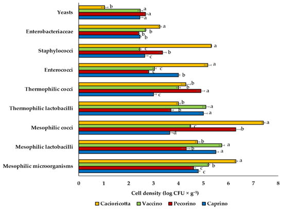 The cell density of total mesophilic microorganisms ranged from 4.6 (Pecorino) to 6.3 (Cacioricotta cheese) log CFU g−1 (Figure 2).