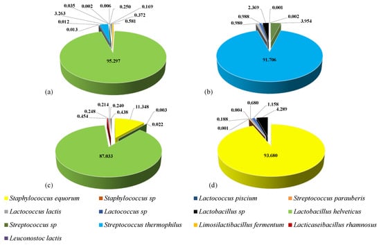 In this cheese, Streptococcus thermophilus (Streptococcus salivarius ssp. thermophilus) was also found as the sub-dominant OTU (ca. 3.3% of relative abundance). This species seemed to dominate the bacterial biota of Pecorino cheese, with a relative abundance of ca. 91% (Figure 3b). In this cheese, Streptococcus sp. (ca. 3.9%) and Lactobacillus sp. (ca. 2.4%) were found as the subdominant OTU. Bacterial biota of Vaccino cheese seemed to be dominated by L. helveticus (ca. 87% of relative abundance) and, to a minor extent, Staphylococcus equorum (ca. 11.3%) (Figure 3c). In Cacioricotta cheese, S. equorum was dominant, with a relative abundance of ca. 94% (Figure 3d). Lactobacillus sp. (ca. 4.3%) and Lactococcus sp. (ca. 1.2%) were found in this cheese as subdominant OTU. Lactococcus sp. and Lactococcus lactis were detected in all the cheeses at a very low relative abundance. Other OTU were variously found (at relative abundance below 1%), depending on the cheese: Limosilactibacillus fermentum (formerly Lactobacillus fermentum) and Lacticaseibacillus rhamnosus (Caprino and Vaccino cheeses), Streptococcus parauberis (Caprino, Pecorino, and Cacioricotta), Lactococcus piscium (Caprino and Cacioricotta), Leuconostoc lactis (Caprino), and Staphylococcus sp. (Vaccino and Cacioricotta cheeses) (Figure 3a–d).