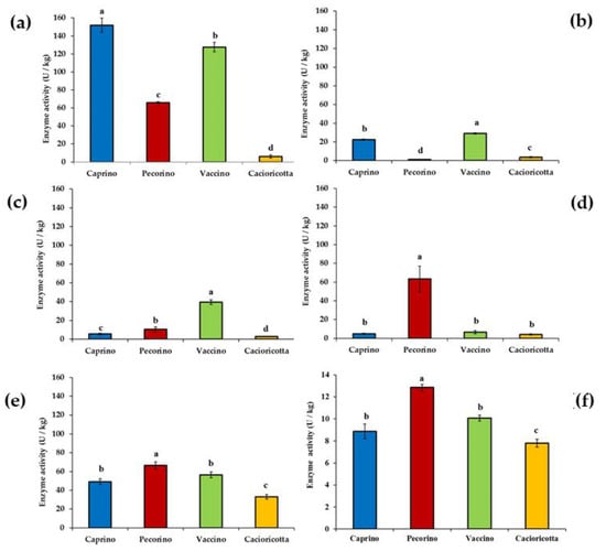 The highest (p < 0.05) residual activity for aminopeptidase type N (pepN) was found in Caprino cheese (ca. 150 U kg−1, Figure 4a).