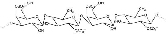 Fucoidan isolated from the brown seaweed species U. pinnatifida was obtained from Auckland, New Zealand [11]. We reported in our previous study that fucoidan from U. pinnatifida was composed of a unique backbone structure with alternating fucose and galactose units, and sulfation at both the C2 and C4 positions, as shown in Figure 1 [8]. This unique structure of fucoidan has been demonstrated to exhibit strong inhibitory activities against starch-digesting enzymes such as amylase, amyloglucosidase, and glucosidase, as reported in our previous work [9]. The binding of fucoidan to these enzymes was proposed to be mediated via electrostatic interactions between the negatively charged sulfate groups of fucoidan and the positive charges of the enzyme molecules [9].