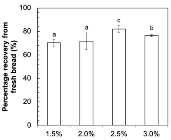 The recovery rate of fucoidan in bread after baking is shown in Figure 2. The recovery rate of fucoidan was 70.3–82.1% after baking. This suggested a loss of approximately 18–30% of fucoidan during the baking process. The decrease in fucoidan could be accounted for by yeast fermentation during proofing [18]. Yoon, Mukerjea, and Robyt [18] and Wilkinson [19] previously reported the ability of baker’s yeast to ferment galactose, a major monosaccharide present in fucoidan from U. pinnatifida. Although the backbone structure of fucoidan is composed of galactose and fucose subunits, it is unlikely that yeast is able to use galactose in polysaccharide form as a substrate for fermentation. However, it was observed in our previous study that the total amount of gas produced in the fucoidan dough samples was significantly higher than that of the control dough samples [10]. This suggests that yeast might have utilized the low-molecular-weight fraction of fucoidan as a substrate to produce gas.