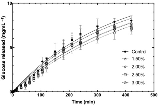 It was reported in the literature that the typical duration required for intestinal chyme to transit through the small intestine is 3–4 h [13]. In our study, at the end of 4 h of the intestinal phase (i.e., t = 240 min), the concentration of RS in the 2.0% and 2.5% fucoidan-fortified bread was ~15%, significantly lower than that by the control bread, while the concentration of RS in the 3.0% fucoidan-fortified bread was 17%, significantly lower than that by the control bread. This suggested a dose-dependent inhibition of starch digestion in baked bread by fucoidan, where the concentration of RS released was reduced (i.e., the inhibition of starch was enhanced) with an increasing concentration of fucoidan.