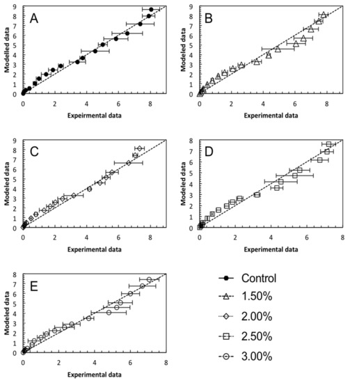 Performance evaluation plots of modelled data against experimental data of: (A) control bread; (B) 1.50% fucoidan-fortified bread; (C) 2.00% fucoidan-fortified bread; (D) 2.50% fucoidan-fortified bread; (E) 3.00% fucoidan-fortified bread.