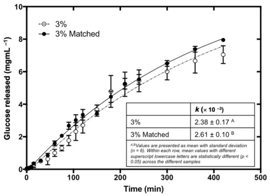 In order to validate the above hypothesis, the digestion curves were modelled to generate the values of the digestion rate constant, k, which are shown in Figure 5. It was observed that the 3% matched bread had a significantly higher k value than the 3% fucoidan-fortified bread, indicating a significantly higher rate of starch digestion in the 3% matched bread sample despite containing the same initial amount of fucoidan before digestion. This difference can be attributed to the differences in molecular size of fucoidan present in both bread samples. Fucoidan is susceptible to degradation at high temperatures [20]. Therefore, it is likely that during the baking process (at 200 °C), fucoidan molecules in the bread samples were degraded into smaller-molecular-weight fractions. It was reported in the literature that the starch hydrolase inhibition activity of fucoidan depended on the molecular weight of the polysaccharide [6]. Kim, Rioux, and Turgeon [6] compared the α-amylase inhibition activity of fucoidan from F. vesiculosus (higher molecular weight) and fucoidan from A. nodosum (lower molecular weight), and concluded that fucoidan from A. nodosum was a stronger inhibitor of α-amylase. The authors attributed the difference in α-amylase inhibition activity to the different molecular weights [6,20]. It was proposed that higher-molecular-weight fucoidan possessed a structural conformation that was unfavorable to interacting with the enzyme [6]. As such, it is plausible to propose that the 3% fucoidan-fortified bread contained lower-molecular-weight fucoidan that was more effective in inhibiting starch digestion than the 3% matched fucoidan of a higher molecular weight.
