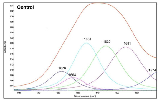 Amide I band of the native gluten control without temperature (25 °C) and the additive treatments. The secondary structure determination by the curve-fitting procedure is indicated.