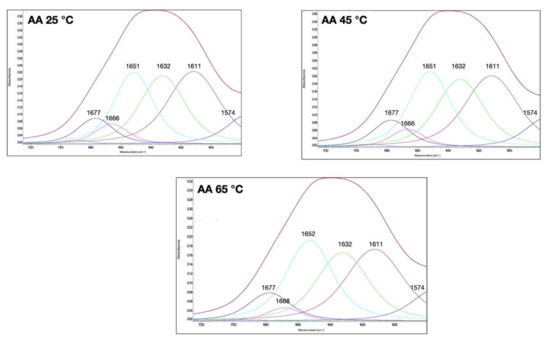Amide I band of gluten at 25, 45, and 65 °C and with ascorbic acid (AA; 100 ppm) treatment. The secondary structure determination by the curve-fitting procedure is indicated.