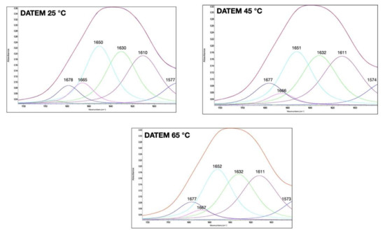 Amide I band of gluten at 25, 45, and 65 °C and with diacetyl tartaric acid ester of monoglycerides (DATEM; 0.6%) treatment. The secondary structure determination by the curve-fitting procedure is indicated.