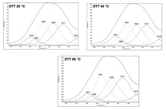 Amide I band of gluten at 25, 45, and 65 °C and with dithiothreitol (DTT) treatment. The secondary structure determination by the curve-fitting procedure is indicated.