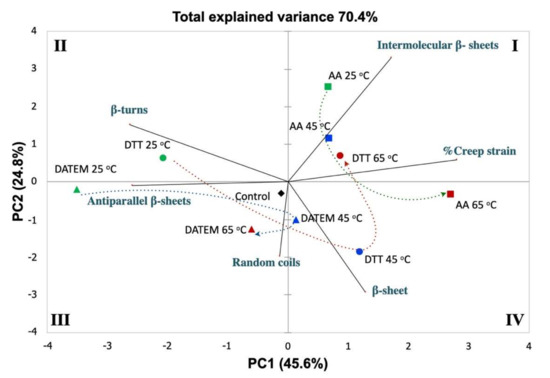 The impact of different temperatures (25, 45, and 65 °C) and additive treatments (AA, DATEM, and DTT) on the secondary structural motifs and viscoelastic properties was depicted in a biplot graph by principal component analysis (PCA). The test was used to present sample grouping and to quantitatively evaluate the relationship based on the chemometrics of the parameters shown in Figure 5. The total explained variance was 70.4%. The first principal component (PC1) accounted for 45.6% of the total explained variance, while the second principal component (PC2) accounted for 24.8%. The main contributors for PC1 were %creep strain, β-turns, and antiparallel β-sheets, with 82.6, 72.4, and 70.5%, respectively. Intermolecular β-sheets and β-sheet were highly significant to PC2. The biplot graph provides the relationship between variables, samples, and among variables and samples. The creep strain of the gluten was negatively correlated with antiparallel β-sheets (r = 0.77, p = 0.05), as they were in the opposite direction in Figure 5 and Table 2. The variables in a 90° direction means that they are independent from each other. Thus, intermolecular β-sheets are independent from β-sheets, along with random coils. However, the study of dough secondary structure revealed that the increase in β-sheet conformation could improve the intermolecular interactions by hydrogen bonds, which have been accepted to be positively correlated to dough viscoelastic properties [36]. Based on Pearson correlation, the β-turns were negatively correlated with %creep strain and β-sheets (r = −0.67 and −0.66, respectively). Overall, the gluten with additives and heating had different gluten secondary structural components and %creep strain, which led to a different extent of gluten polymerization. Gluten samples with 0.6% DATEM were in quadrant three, closely related to antiparallel β-sheets and random coils, while the samples with 25 mM DTT were in the middle between samples with 0.6% DATEM and 100 ppm AA heated at 65 °C. After heating the gluten with DTT, it was highly correlated with β-turns and antiparallel β-sheets at 25 °C, and then had a high correlation with β-sheet at 45 °C. After increasing the temperature to 65 °C, the gluten with DTT had moved to be close to the %creep strain, which means it had more deformation after heating. AA gluten samples were related to intermolecular β-sheets at 25 °C, and had a higher correlation with %creep strain after heating at 65 °C compared to other treatments.