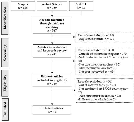 The initial search was performed on 1 November 2021, in three electronic databases: Web of Science™, Scopus®, and SciELO databases. These databases were selected as they are comprehensive and cover a broad range of journals in the food science field. Searches were limited to title, abstract, and keywords, using the following search strategy: ((consum* OR custom*) AND (“food safety”) AND (“risk perception” OR belie* OR percept*) AND (Brazil OR Russia OR India OR China OR “South Africa”) NOT (“food handler”)). Filters were used to restrict the results to papers included only in peer-reviewed journals. No language limits were included in this study. Only articles published between 2003 and 2022 were included in the study. The following inclusion criteria were adopted: (a) adults (≥18 years old), (b) quantitative and qualitative methodological approaches, and (c) face-to-face and non-face-to-face methodological approaches. The following articles were excluded: research that (a) has no full-text available; or (b) was part of “gray” literature (i.e., literature that has not been peer-reviewed).