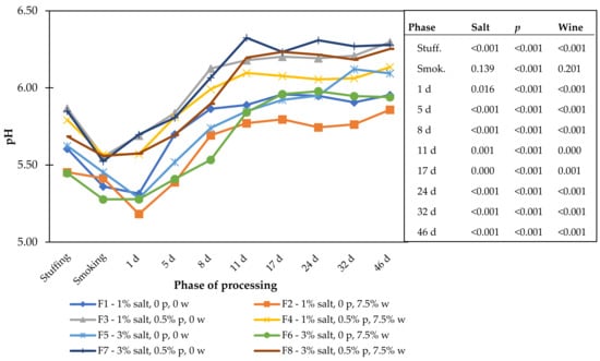 All the effects under study influenced the pH (Figure 1), with significant differences in almost all processing phases. The use of phosphates promoted a slight increase in pH, and the wine had a slight reduction. The effect of salt, still statistically significant in several processing phases, is not clear enough to establish a pattern. The evolution of pH during processing has a typical pattern of an initial decrease followed by an increase after the beginning of drying [].