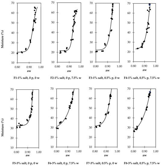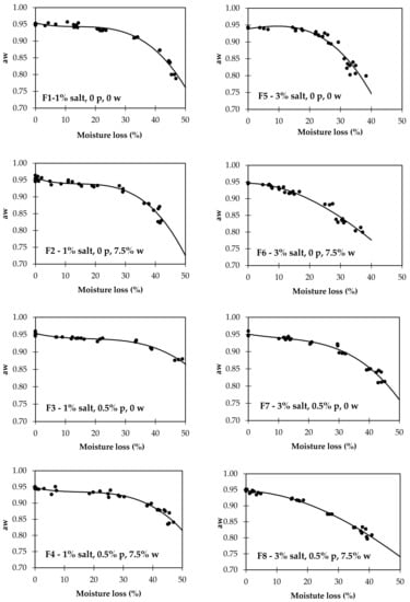The interest of these findings is primarily theoretical, validating the importance of salt in aw reduction, providing new clues on the complex influence that phosphates have on aw, and bringing new insights into the effect of wine on dry-cured sausage aw. Several nonlinear regression functions were tested to establish the relationship between moisture loss and aw, and the best fitting was obtained with the Boltzmann sigmoid function. The determination coefficients evaluated the fitting quality (R2), the lowest root mean square error (RMSE), and the visual analysis of the curve. As observed in previous studies, the formulation highly influences the relationship between moisture and aw in dry-cured sausage. Figure 3 and Table 3, where all the data from the eight formulations were used, illustrate the difficulty of establishing the relationship once the interpolation is poor (R2 = 0.737), particularly after 20% moisture loss, the phase where the ingredients and additives have a higher impact. The poor quality of this nonlinear regression does not allow us to use it for any estimation purposes. Once the salt level was one of the main effects of the present study, we performed the regression for both levels of salt added separately. The quality of these regressions was also poor. Thus, eight nonlinear regression equations of the curves were calculated (Table 3, Figure 4). The best-fitting was observed for F8 (R2 = 0.988, RMSE = 0.006), and the worst-fitting was observed for F3 (R2 = 0.933, RMSE = 0.013). These parameters are compatible with estimation purposes [].
