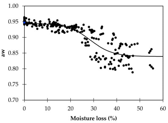 For a specific formulation, aw is highly related to the loss of moisture by drying, and the loss of moisture is most of the product’s weight loss []. Direct aw measurement is the method used by the industry to monitor the effectiveness of drying; however, small industries and workshops in mountainous regions do not have the equipment or expertise to conduct this with reliability. In these cases, the liberation of the product is estimated by weight loss or by palpation. This informality might result in the liberation of products with a still-unsafe aw. Producers might also face economic losses due to the excess drying. The possibility of estimating the aw from the moisture loss, with more precision than the informal decision made in several small industries and workshops, could help these producers to have a better perception of their dry-cured sausage aw.
