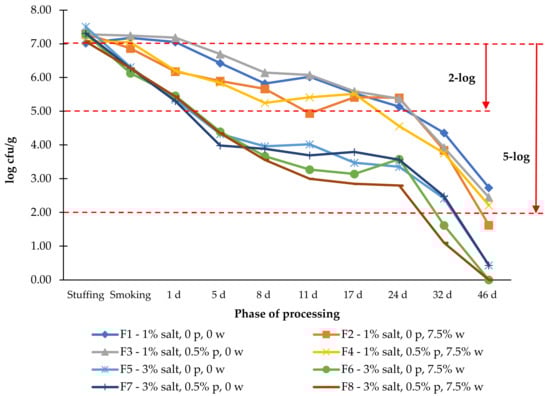 The initial inoculation was approximately 7 log cfu/g to demonstrate the 5-log reduction proposed by USDA/FSIS []. Analyzing the evolution of the pathogen, it is clear that after the smoking phase, the effect of the higher salt level on a faster reduction of the pathogen has a plateau between 8 and 24 days of drying. In 3% salt dry-cured sausages, when wine was used (F6 and F8), a 5-log reduction was achieved at 32 days, while those without wine did not meet that criterion until later in the drying process. At the maximum drying period tested, 46 d, when low salt was used, only the sausages without phosphate and wine achieved a 5-log reduction. These results might seem worrying, as they suggest that extensive drying is necessary to make the product safe, leading to yield and texture adequacy losses. However, an initial count of 7 log cfu/g is theoretical and has no parallel in the reality of a reasonably hygienic industry or workshop. A more realistic amount of initial Salmonella contamination might be approximately 2 log cfu/g. With contamination of that order, a 2-log reduction will be sufficient to make the product safe. The 2-log reduction in the data presented here should be carefully interpreted, as it will eventually be biased due to the high initial contamination and consequent competition deregulation among the sausage microbiota. We can observe that when a higher level of salt is used, a 2-log reduction is achieved at five days of drying when the aw is still high (0.93–0.94). When only 1% salt is used, only after 32 d of drying is the 2-log reduction met, with the sausages already having a very low aw (0.83–0.87). The lethality observed in the present work was lower than that observed with a similar product by several authors [,,].