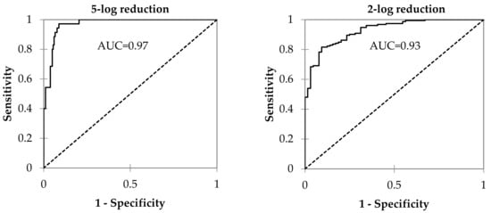 Both models have good predictive ability, as revealed by the high area under the curve (AUC) of the receiver operating characteristic curves (ROC) (Figure 6). For the 5-log reduction, the AUC was 0.97, and for the 2-log reduction, it was slightly lower (0.93). As the AUC approaches 1, the model’s prediction ability improves, indicating that most of the events will be correctly predicted [].