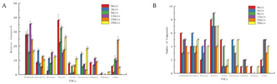 Relative content (A) and number (B) of VOCs in defatted tiger nut flour. Different lowercase letters in the same classification indicate that there was a significant difference (p < 0.05).