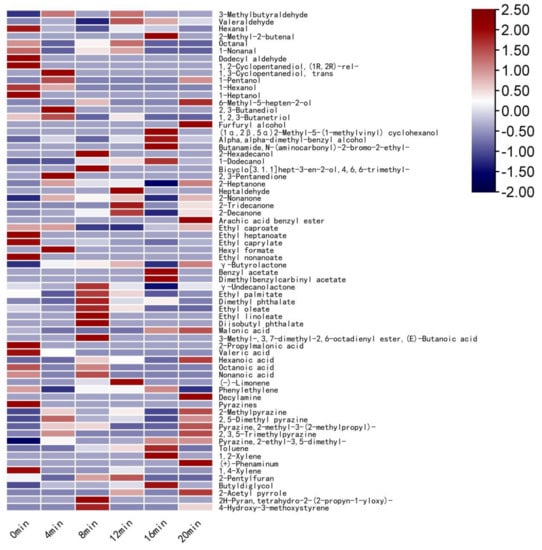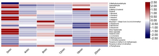 In the heat map, the difference between the content of various VOCs and the average content is indicated by different shades of color, providing a more visual indication of the differences between the samples []. The relative content of each volatile flavor compound is marked with a different color in the heat map. The darker the red, the greater the relative content, and the darker the blue, the less the relative content []. As can be seen from Figure 2, when the defatted tiger nut flour was baked for 8 min, the relative contents of 2-pentylfuran (buttery and floral), caprylic acid (cheese), nonanoic acid (fatty and coconut), γ-undecanolactone (peach, coconut, and milk), and bicyclo[3.1.1]hept-3-en-2-ol,4,6,6-trimethyl-(verbena) were significantly higher. When baked for 8 min, the defatted tiger nut flour had more positive VOCs and the relative content was higher, indicating that the richness of its aroma was greater. When baked for 16 and 20 min, the VOCs of defatted tiger nut flour were mainly composed of pyrazines, with coffee and burnt aromas. At this point, the richness of the aromas decreased significantly and their sensory quality was low.