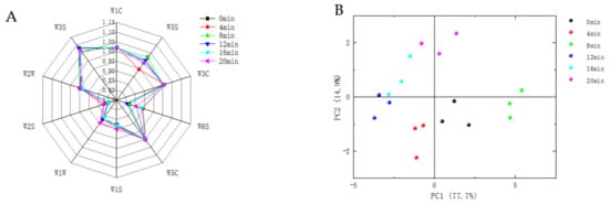 It can be seen from Figure 4A that the profile and area of the radar plot had some variation. The response intensity of the sensors W1C, W5C, W3S, W2W, and W3C was higher with slight variation, indicating that the contents of the aromatic compounds, benzene, ammonia, olefin, short-chain aromatic compounds, organic sulfides, and long-chain alkanes in the samples were high, but the changes were not significant. The sensors W2S, W1W, W6S, W1S and W5S changed significantly, indicating that baking had a significant effect on alcohols, aldehydes, ketones, sulfur compounds, hydrogen, nitrogen oxides and methyl components. This was related to the results of the above VOCs—the relative contents of alcohols, aldehydes, ketones, esters, and pyrazines were greater, and the changes were more significant.