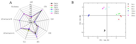 The radar plots of defatted tiger nut flour baked for 4 and 8 min were closer, indicating similar tastes. Their plots were far away from that for the unbaked defatted tiger nut flour, indicating that the taste was significantly different after baking. However, overbaking will cause the defatted tiger nut flour to produce unfavorable tastes such as astringency and bitterness, and produce coffee, burnt and other odors. When samples were baked for 12, 16, and 20 min, the respective defatted tiger nut flour radar plots were far away from that for the unbaked defatted tiger nut flour, and the samples began to develop bitterness; the sweetness decreased, and the overall taste worsened. According to the above, the VOCs, E-nose and E-tongue changed, the taste and odor of the defatted tiger nut flour were greatly changed at these baking times—its original flavor was lost, changing into a caramel and burnt flavor, indicating that its flavor decreased.