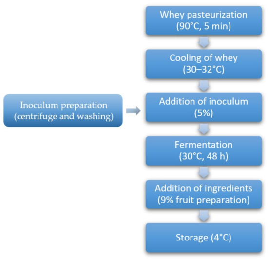 Whey is the watery part of milk which separates from the curds in the manufacture of cheese. A distinction is made between sweet whey, which is obtained by the addition of rennet (pH = 6–7), and acid whey, when coagulation occurs through the action of acid (pH < 5) [17]. This by-product contains about 50% of the nutrients/dry matter of milk [18], including lactose (70–80% DM), proteins (9% DM), minerals (8–20% DM) and other minor components [17,19]. The content of lactose and other nutrients makes whey a potential raw material for the development of probiotic microorganisms that enable the production of fermented beverages [18,20]. As a by-product of cheese production, whey can pollute the environment [21]. The excess of this by-product is one of the major problems for the dairy industry, especially for small and medium enterprises, because the cost of its treatment is high [22]. Dairy beverages fermented from whey and with probiotic cultures added represent an excellent innovative alternative, as they have functional properties and allow the use of whey, minimizing the negative impact on the environment, without requiring large investments or significant changes in the production routine [21]. Studies reporting the development of fermented dairy beverages from whey show high acceptance from a sensory point of view [23,24,25,26].