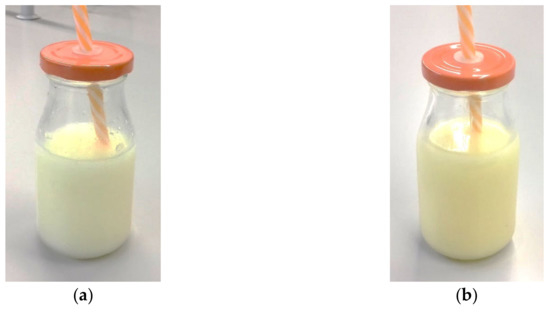 Presentation of the finished product—fermented whey beverage with E. malodoratus SJC25. (a) Pineapple flavored beverage; (b) passion fruit flavored beverage.