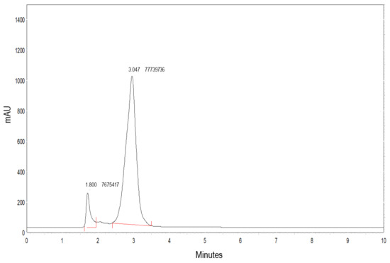 An example of a chromatogram of a passion fruit whey-based beverage with 14 days of storage at 4 °C is shown in Figure 3. The first peak corresponds to GLU with a retention time of 1.8 min and the second peak corresponds to GABA with a retention time of 3.1 min.