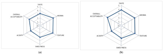 Sensory evaluation of beverages (scores 1–5) of fermented whey beverages: (a) pineapple beverage; (b) passion fruit beverage.