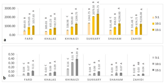 The results regarding TPC are presented in Figure 1a. TPC measurements ranged from 389.03 to 2365.75 µg GAE/g at 5:1 and 15:1 sample to solvent ratio levels, respectively. The data clearly show that higher sample to solvent ratios had a higher content of polyphenols. The results of our study did not correlate with previous investigations of the TPC of certain date seed varieties. The TPC of Khalas seed was 2194 µg/g [41]; for Khinaizi and Zahidi it was 9540 and 11,610 µg/g [42], respectively. For Sukkary it was 37.1 µg/g [43], while in another study it was 2058 µg/g for Zahidi [44]. This variation appears related to different extraction methods [42], and the use of water as opposed to other solvents in extraction, which has been proven to have low solubility for phenolics and flavonoids [1]. For example, in Ardekani et al., higher TPCs were detected when the polar aprotic solvent dimethyl sulfoxide (DMSO) was used in comparison to common polar solvents (water, aqueous methanol, and methanol) [42]. This underlines the importance of the extraction solvent when determining TPC.