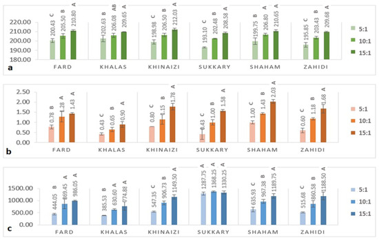 (a) DPPH radical scavenging activity (µg Trolox equivalent/g sample); (b) ABTS radical scavenging (% Scavenging effect with ABTS/mg) %; (c) Ferric reducing assay, (µg equivalent Trolox/g) of six varieties of date seed powder extracted at three sample to solvent ratios (5:1, 10:1, and 15:1). Different uppercase superscript letters in a variety denote significant differences, p < 0.05.
