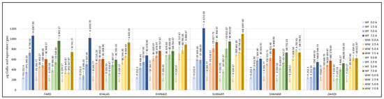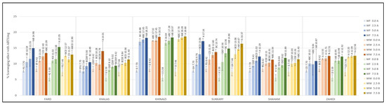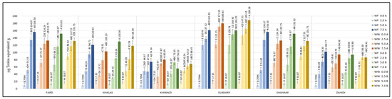 Regarding DPPH, the control cookies had values of less than 18.87 µg/g, and even the cookies with the lowest substitution level had values more than four-fold higher than the control, except for Khalas- and Khinaizi- made cookies (regardless of flour type and temperature), where the values only double. Even though Sukkary date seed powder was insignificantly different from other varieties the Sukkary cookies had the highest antioxidant activity, with more than 161.05 µg/g at 7.5% substitution level, while Khinaizi cookies had the lowest at all substitution levels, with no more than 80.39 µg/g, which is opposite from the ABTS results. Khinaizi cookies had the highest measurements, with more than 18.23% ABTS/g at the highest substitution level, slightly higher than Sukkary cookies (17.16% ABTS/g). Mistrello et al., Al Juhaimi et al., and Ardekani et al., showed high antioxidant activity in Sukkary date seed powder, where it seems that it contributes to the high antioxidant activity in composite cookies as well [43,44,46]. Very slight differences were observed between the Fard, Khalas, Shaham and Zahidi varieties; ABTS ranged from 7.6% to 12.7%, 9.02% to 12.40%, and from 9.42% to 15.35% ABTS/g at 2.5%, 5.0%, and 7.5% respectively.