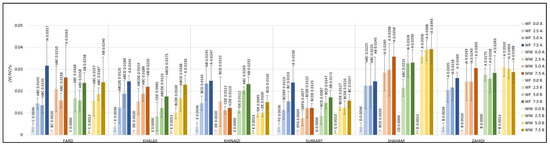 On the other hand, it was expected that the high flavonoid content found in Khinaizi date seed powder (Figure 1b) would lead to Khinaizi cookies having the highest values (Figure 4); instead, composite cookies of Shaham and Zahidi had the highest content of flavonoids, up to 0.0393 (w/w) %. Cookies formulated with Fard, Khalas, Khinaizi, and Sukkary had mostly similar measurements, ranging from 0.0077 (w/w) % at 2.5% substitution level to 0.0317 (w/w) % at 7.5%. A similar pattern was observed between Sukkary composite cookies and Sukkary flour observations; i.e., despite having the highest TPC level, the flavonoid content was comparatively lower than the other date seed varieties, although higher than the control cookies. Though the TPC and flavonoid content of cookies increased with higher levels of date seed flour, a substantial decrease in those levels in cookies in comparison to flour was observed upon baking. The reason behind this could be attributed to the loss of phenolic components during baking [53].