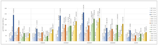 The TPC of cookies enriched with date seed powder was measured; the contents are listed in Figure 3. The highest TPC of the control cookies (zero date seed powder substitution) was 265.77 µg/g. Almost all the composite cookie formulations showed higher TPC levels above 265.77 µg/g, except Zahidi with 2.5% substitution level of white flour at both 180 and 200 °C temperature conditions. Cookies formulated with 7.5% Fard variety made with white flour at either temperature had significantly higher TPC content, more than 962.17 µg/g, and at substitution level of 7.5% the TPC level were more than three-fold higher compared to the control cookies. The TPC of Khalas cookies at 7.5% substitution level was the highest when made with white flour and baked at 180 °C and with whole wheat flour baked at 200 °C. The values of Khinaizi and Shaham cookies were mostly similar. The highest value of TPCs, observed in Sukkary date seed powder (Figure 1a) at 7.5% substitution level, explains the highest values of Sukkary-made cookies, which range from 940.37 to 1213.00 µg/g, almost four times higher than control cookies, and which differs from the TPC of Zahidi-made cookies, which presented the lowest effect among all varieties with value of 621.87 µg/g when made with 7.5% substitution level, whole wheat flour and baked at 200 °C. Some previous studies on the total phenolic content of date seed powder exhibited high polyphenol content, for example, in Sukkary [43,44,46], strengthening the results of this study.