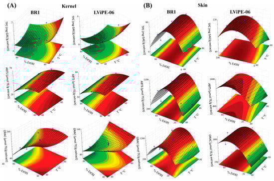 Three-dimensional response surface plots generated for kernels (A) and skins (B) of BR1 and LViPE-06 peanut genotypes assessed, showing the regions of higher antioxidant activity (red). Axis x corresponds to % EtOH, axis y corresponds to the temperature (°C), and axis z corresponds to the total phenolic content (TPC) or deactivation activity of ABTS•+ or ROO• radicals (ABTS or ORAC, respectively).