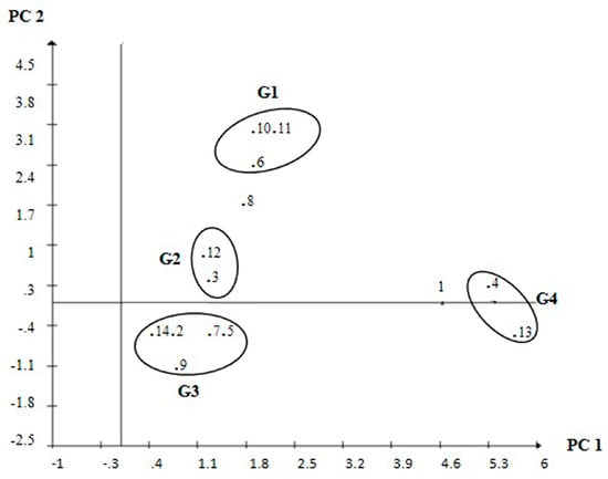 Pairwise score plot between the two first principal components (PC), based on the phenolic composition of skin extracts of different peanut genotypes. Clusters identified as G1, G2, G3 and G4. 1-BR 1, 2-LViPE-06, 3-Senegal 57422, 4-Tatu, 5-Florunner, 6-BRS 151 L7, 7-FM424B, 8-FM407B, 9-Porto Alegre, 10-L7 Bege, 11-Senegal 55437, 12-L50, 13-M407.424B, 14-LGoPE-06.