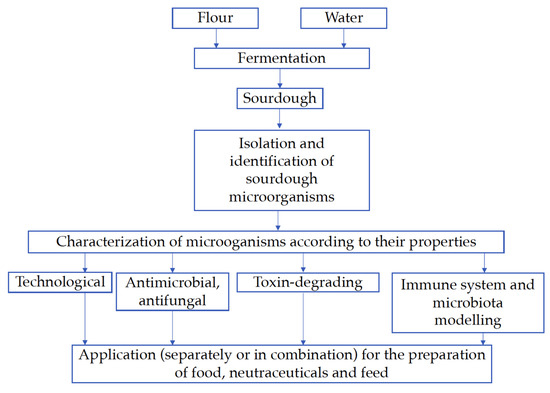 As could be seen from this review, there are many applications of sourdough LAB. In addition to their application as pure technological strains in the food and feed industries, taking into consideration the antimicrobial, antifungal, immuno-, and microbiota-modulating properties of these microorganisms, they could be used as valuable ingredients in higher-value food as well as nutraceutical formulations. Additionally, a very promising application of LAB is their use in combination with plant- and/or animal-based ingredients to increase the functional properties of the whole combination due to different mechanisms of action, as well as desirable symbiotic activity. Finally, taking into consideration that sourdough LAB application at an industrial scale is not efficient enough, this review is intended to highlight that bread sourdough is a very promising source of technological microorganisms, which has great potential at an industrial scale. Future prospects for sourdough LAB application are very broad, as they have potential to be used in a wide range of agri-food industries—such as baking, feed and pet food, dairy, meat, nutraceuticals, alcoholic and non-alcoholic beverages, cosmetics, pharmaceuticals, chemicals, etc.