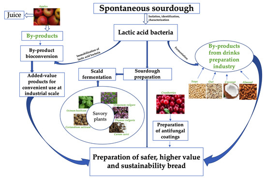 Finally, it can be stated that the use of LAB starters isolated from spontaneous sourdough, with known characteristics, has a wide range of benefits, including not just safer, higher-value and sustainable bread preparation but also the reduction in challenges associated with the valorisation of food industry by-products (Table 1). Finally, fermentation technology and sourdough microbiota lead to a more environmentally friendly industry.