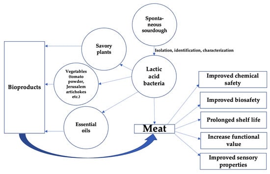 The possible uses of pure LAB starters and their combinations for the preparation of safer, higher-value, and more acceptable meat and meat products are shown in Figure 3.