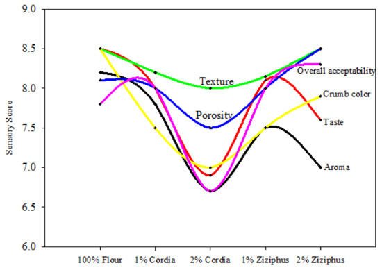 | 2% Cordia | 0.52 ± 0.00 d | 0.29 ± 0.01 b | 2.81 ± 0.01 c | 9.73 ± 0.05 c | 0.55 ± 0.01 b | 0.37 ± 0.05 c |