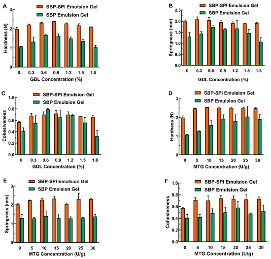 The hardness (A,D), springiness (B,E), and cohesiveness (C,F) of SPI-SBP and SBP emulsion gels induced by L&GDL (A–C) and L&MTG (D–F).