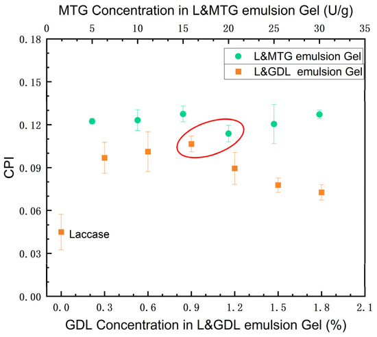 Figure 2 shows CPI of emulsion gels under different induction methods, and the CPI value of the emulsion gel induced by L&MTG was generally higher than that of the gel induced by L&GDL. To analyze the effect of different induction methods on the SPI-SBP emulsion gel, induction combinations that yielded similar CPI were selected and marked with a red circle, as shown in Figure 2, for the subsequent studies. In the proceeding studies, the GDL concentration of the L&GDL SPI-SBP emulsion gel was set at 0.9%, and the MTG addition of the L&MTG SPI-SBP emulsion gel was set at 20 U/g.