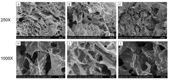 The SEM micrographs of SPI-SBP emulsion gels induced by laccase (A), L&GDL (B), and L&MTG (C) in 250×. (D–F) are a section of images (A–C) with higher magnification (1000×).