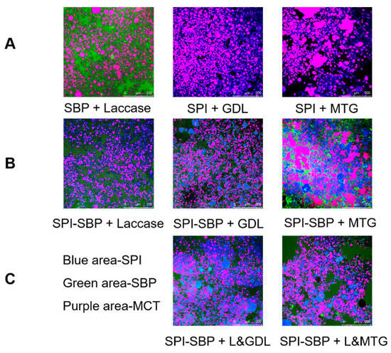 In Figure 4, the green area of the CLSM result represents the FITC-labeled SBP, the blue area represents rhodamine-stained SPI, and the red area indicates Nile Red-stained MCT oil droplets (red oil droplets appear purple due to superposition with blue protein). As shown in Figure 4A, oil droplets were embedded in the networks of SPI or SBP. An aggregation of oil droplets occurred in the SPI emulsion gel induced by MTG alone, because MTG treatment increased the interfacial and surface tensions of proteins and the formation of a stronger interfacial gel network during gelation, which caused the rupture and re-aggregation of oil droplets [28]. In contrast, GDL can quickly disperse into the emulsion system and slowly release hydrogen ions to form a uniformed SPI network [29], so that the oil droplets can disperse uniformly in the network. Compared with the SPI and SPI-SBP emulsion gel induced by MTG alone in Figure 4A, B, the rupture and aggregation of oil droplets in the SPI-SBP emulsion gel induced by the duo-induction of L&MTG, presented in Figure 4C, was alleviated, indicating that the SBP network structure induced by laccase can support and protect the oil droplets to a certain extent, and reduce the damage to the oil droplets when MTG induces the SPI gel network. For L&GDL SPI-SBP emulsion gel, the internal matrix distribution of the emulsion gel induced by GDL was relatively uniform. SPI was in an aggregated state and dispersed within the network of SBP, and the oil droplets were embedded within the SPI and SBP network, which is in agreement with the previous study [6].