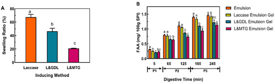 The swelling properties (A) and the digestive profiles of FAA (B) and FFA (C) for SPI-SBP emulsion gels induced by different methods. Different letters indicate significant differences in the same group at p < 0.05 level. P1: Oral Phase; P2: Gastric Phase; P3: Intestinal Phase.