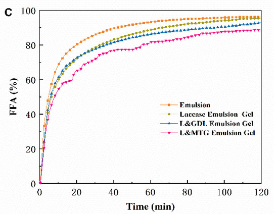 As shown in Figure 5B, FAA released during digestion increased gradually in all samples. During the early stage of the gastric digestion phase (P2, 5–65min), the L&MTG emulsion gel showed that a larger amount of FAA released. Because of the dense structure, the L&MTG emulsion gel should have a lower degree of hydrolysis and FAA release rate than L&GDL emulsion gel during digestion; however, the results showed that was released at a greater rate for L&MTG in the oral digestion phase (P1) until the middle of P2. This is because compared with GDL induction, gelation by MTG resulted in more uncross-linked proteins [22], which were digested more easily than the proteins cross-linked in the gel network. At the end of P2 (125 min), the L&MTG emulsion gel began to present its advantage of having a denser structure, which resulted in releasing a lower amount of FAA. In this phase, the protein that was most hydrolyzed was the cross-linked one in the gel network, and the denser structure of the gel network led to the lower rate of hydrolyzation for cross-linked proteins [31]. At the end of the intestinal phase (P3), the order of the FAA release amount from highest to lowest was as follows: the emulsion, the emulsion gel induced by laccase alone, L&GDL emulsion gel, and L&MTG emulsion gel. Out of the three induction methods, the L&MTG emulsion gel had the lowest FAA release, due to the lowest swelling ratio with small pore size, preventing the digestive enzymes from entering into the gel network and imparting the effect of enzymolysis [32].