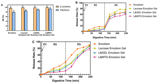 EE is essential to the performance of the nutrient delivery system, and affects the storage and bioavailability of functional factors that are embedded in the delivery system [35]. In this study, the hydrophilic phase (SPI-SBP network) was loaded with the riboflavin, and the lipophilic phase (MCT) was loaded with β-carotene. As indicated in Figure 6A, there was no significant difference in the EE of β-carotene between the laccase emulsion gel and duo-induced emulsion gels. The oil droplets containing β-carotene were wrapped in the gel network, which reduced direct contact of the oil droplets with the outside environment [36]. For the riboflavin embedded in the water phase, compared with the SPI-SBP emulsion, the emulsion gel had higher EE of riboflavin. The order of EE for riboflavin from low to high was as follows: the emulsion, the emulsion gel induced by laccase alone, L&GDL emulsion gel, and L&MTG emulsion gel. The EE of hydrophilic functional factors is related to the porosity of the gel matrix [37]. Combined with the results from previously stated microstructure and swelling ratio measurement, the SPI-SBP emulsion gel that had a looser and more porous structure tended to have lower EE of riboflavin.