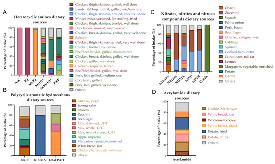 Main dietary sources of xenobiotics in the study sample. (A) Heterocyclic amine dietary sources. AαC, amino-alpha-carboline; IQ, 2-amino-3-methylimidazo (4,5,f) quinoline; MeIQ, 2-amino-3,4 dimethylimidazo (4,5,f) quinoline; MeIQx, 2-amino-3,8 dimethylimidazo (4,5,f) quinoxaline; DiMeIQx, 2-amino-3,4,8 trimethylimidazo (4,5,f) quinoxaline; PhIP, 2-amino-1-methyl-6-phenylimidazo (4,5,b) pyridine. (B) Polycyclic aromatic hydrocarbon dietary sources. B(a)P, benzo (a) pyrene; DiB(a)A, dibenzo (a) anthracene; Total PAHs, total polycyclic aromatic hydrocarbons. (C) Nitrate, nitrite, and nitroso compound dietary sources. NDMA, N-nitrosodimethylamine; NPIP, N-nitrosopiperidine; NPYR, N-nitrosopyrrolidine; Comb., combined nitroso compounds. (D) Acrylamide dietary sources.