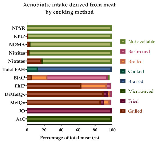 As depicted in Figure 2, microwaved, fried, grilled, broiled, barbecued, and braised cooking methods were mainly responsible for the intake of HAs and PAHs through the cooking of meat in the sample, whereas nitrates, nitrites, and nitrosamines (N-nitrosodimethylamine (NDMA), N-Nitrosopiperidine (NPIP), and N-Nitrosopyrrolidine (NPYR)) derived from grilled and other nonspecified methods. Processed meats were the main dietary source of these compounds (Figure 1), and they also contributed to the intake of hydrocarbons (B(a)P, not available) and amines (AαC and MeIQx, microwaved).