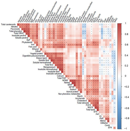 On the other hand, it was noteworthy that the direct associations reported between most of the main xenobiotic compounds and dietary compounds were from an animal origin, such as cholesterol, total lipids, MUFAs, PUFAs, SFAs, animal protein, iron, and sodium. These components were positively, and in most cases significantly, related to compounds belonging to the group of HAs. Nitrates, which mainly come from plant-based foods, have been directly related to compounds such as fiber and its subtypes (insoluble fiber, soluble fiber, insoluble cellulose, insoluble hemicellulose, insoluble pectin, soluble pectin), total carotenoids, total phenolics, flavonoids, or total ORAC, all of which have a proven beneficial impact on intestinal homeostasis preservation [14]. Thus, the upper limit of safety for the intake of xenobiotics may be conditioned by the subject’s antioxidant intake. In this regard, it has been shown that the intake of nitrates over 142.5 mg/day increases the risk of colon cancer only in those cases with a daily intake of vitamin C under 83.9 mg/day [46], and the intake of NDMA ≥ 0.07 μg/day was associated with an increased risk of this pathology with levels of vitamin E under the recommended amounts [47].